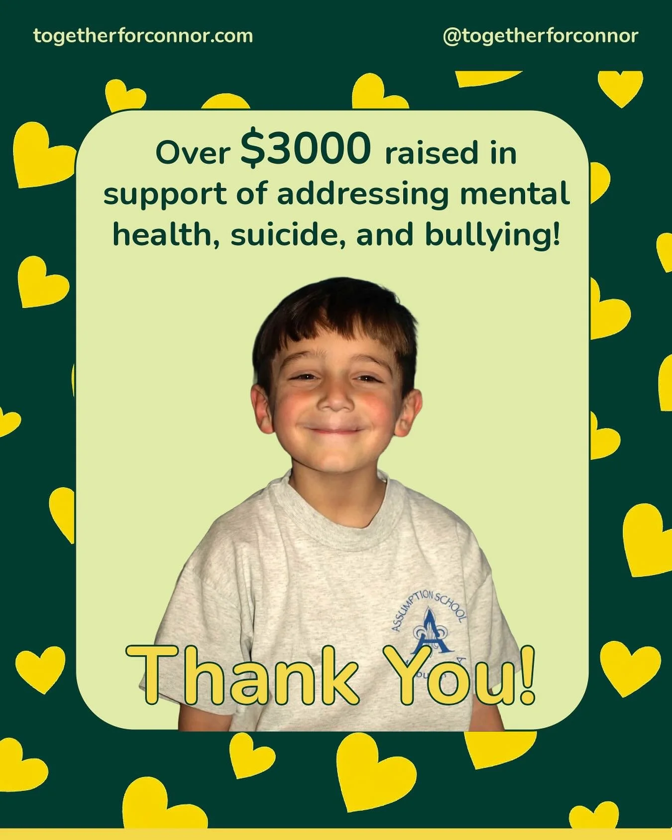 Connor was a kind, witty, and intelligent child, who still had a lot to offer this world. After struggling with his own mental health challenges and bullying, Connor tragically took his own life at the age of 15 years old.